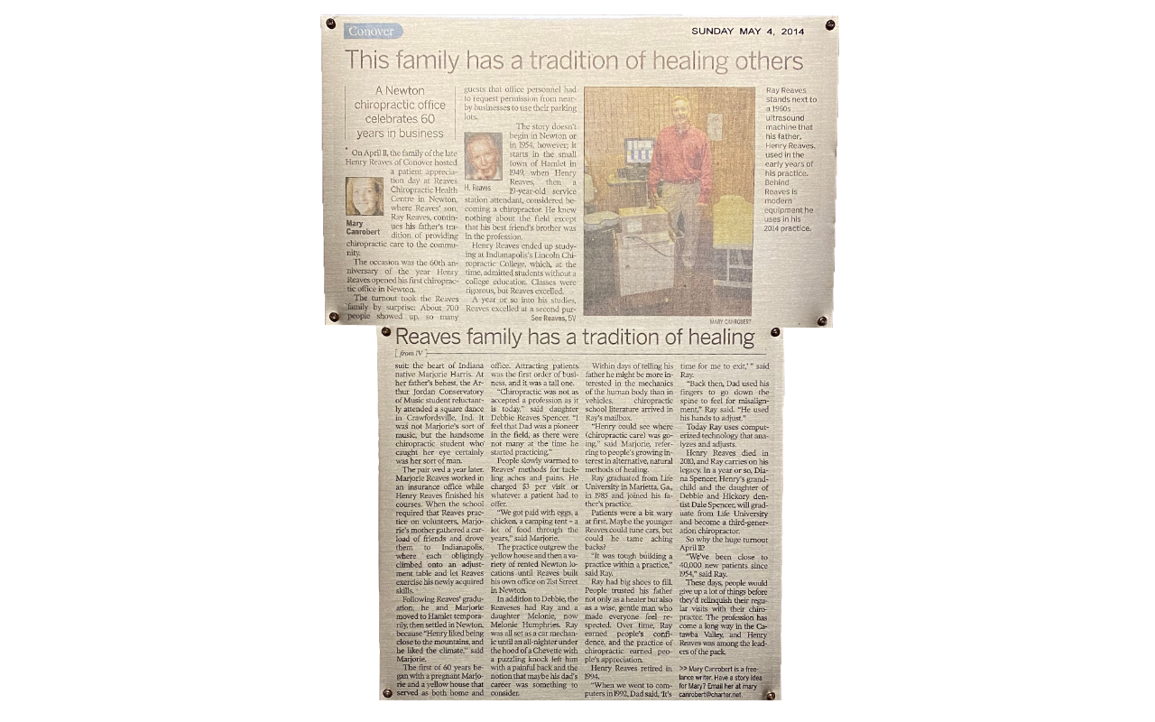 On April 11th, the family of the late Henry Reaves of Conover hosted a patient appreciation day at Reaves Chiropractic Health Centre in Newton, where Reaves' son, Ray Reaves, continues his father's tradition of providing chiropractic care to the community. The occasion was the 60th anniversary of the year Henry Reaves opened his first chiropractic office in Newton. The turnout took the Reaves family by surprise: About 700 people showed up, so many guests that office personnel had to request permission from nearby businesses to use their parking lots. The story doesn't begin in Newton or in 1954, however; it starts in the small town of Hamlet in 1949, when Henry Reaves, then a 19-year-old service station attendant, considered being a chiropractor. He knew nothing about the field except that his best friend's brother was in the profession.